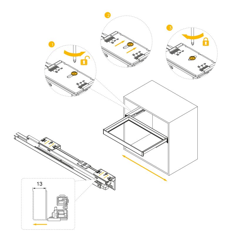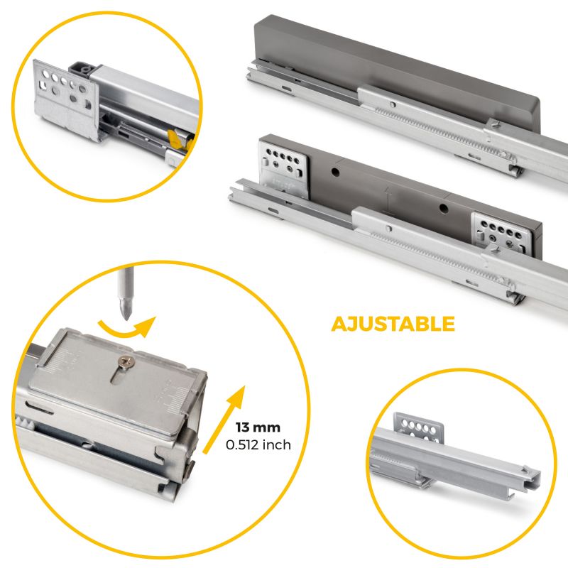 Le cadre coulissant en aluminium s’installe facilement à l’intérieur de meubles de 562 à 588 mm de large. Avec une profondeur minimale de 460 mm et un réglage latéral de 13 mm par glissière, il permet une adaptation parfaite. Les glissières à fermeture douce assurent une ouverture fluide et silencieuse, même en usage quotidien intensif.