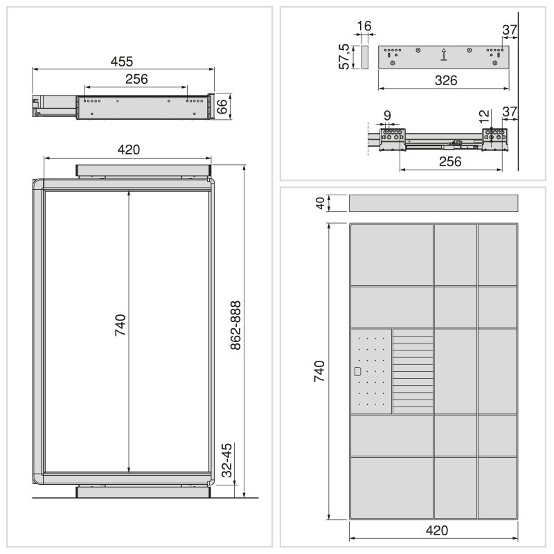Le cadre en aluminium avec coulisses à extraction totale et fermeture douce, s’installe facilement sur les côtés du meuble. Il est compatible avec une ouverture intérieure de 662 à 688 mm et s’adapte à tous les environnements grâce aux coulisses réglables et aux entretoises fournies. Il supporte jusqu’à 30 kg.