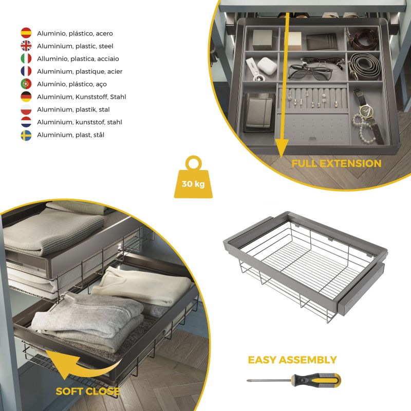 Offrez à votre armoire une solution de rangement pratique, élégante et bien pensée avec le tiroir en fil métallique Quartz pour meuble de 800 mm de la marque Emuca. Ce système associe un châssis en aluminium à extraction totale et fermeture douce à un tiroir en fil d'acier finition titane, pour un aménagement raffiné et fonctionnel.