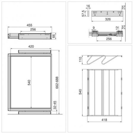 Le cadre coulissant en aluminium se fixe latéralement à l’aide de vis et s’ajuste avec précision grâce à un réglage de 13 mm par coulisse, couvrant une largeur intérieure de 662 à 688 mm. Il supporte jusqu’à 30 kg, garantissant robustesse et confort d’utilisation. Le panier à chaussures en acier, d’une largeur de 540 mm, assure une excellente visibilité du contenu tout en permettant une aération optimale. Il évite ainsi l’humidité et les mauvaises odeurs, tout en maintenant un aspect soigné dans votre dressing.