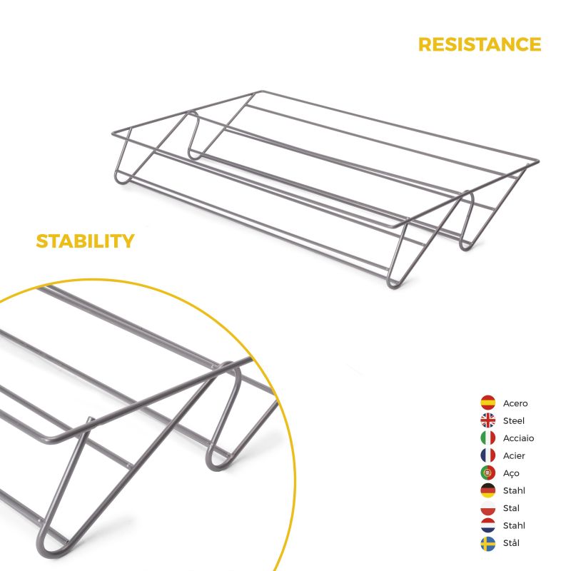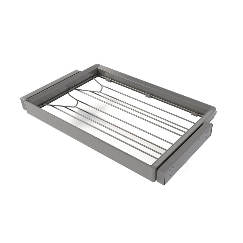 Le cadre coulissant en aluminium se fixe latéralement à l’aide de vis et s’ajuste avec précision grâce à un réglage de 13 mm par coulisse, couvrant une largeur intérieure de 662 à 688 mm. Il supporte jusqu’à 30 kg, garantissant robustesse et confort d’utilisation. Le panier à chaussures en acier, d’une largeur de 540 mm, assure une excellente visibilité du contenu tout en permettant une aération optimale. Il évite ainsi l’humidité et les mauvaises odeurs, tout en maintenant un aspect soigné dans votre dressing.