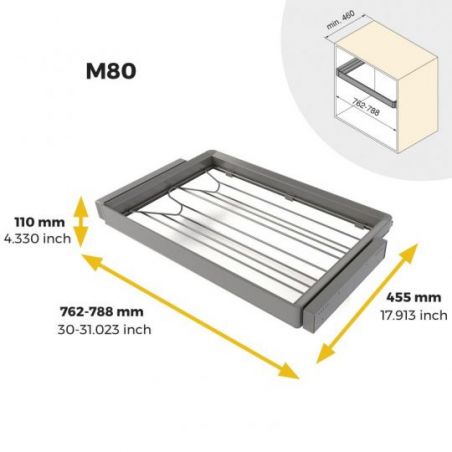 Le cadre coulissant s’installe facilement par vissage latéral et s’ajuste avec précision grâce à ses coulisses réglables de 13 mm, idéales pour s’adapter à une ouverture intérieure comprise entre 762 et 788 mm. Fabriqué en aluminium de haute qualité, il supporte jusqu’à 30 kg de charge et garantit une extraction fluide et silencieuse. Le tiroir en fil métallique, aéré et robuste, améliore la visibilité tout en préservant vos chaussures de l’humidité, des odeurs et de la poussière.