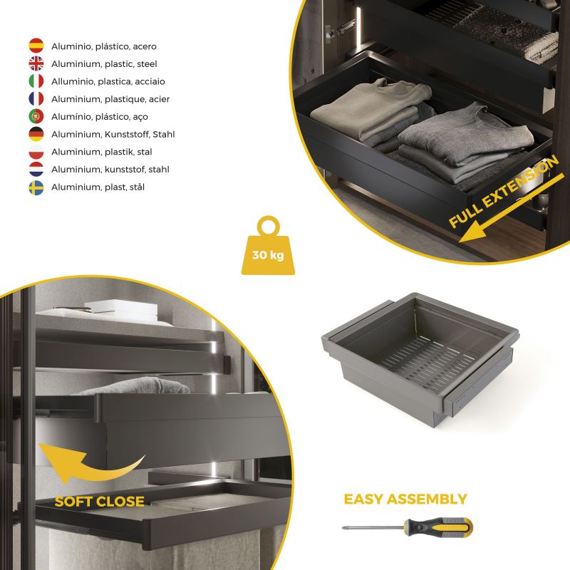 Offrez à votre armoire une touche de raffinement et un rangement structuré avec le panier métallique sur cadre coulissant Quartz de Emuca, conçu pour les meubles de 600 mm de large. Élégant, pratique et robuste, il comprend un cadre coulissant à fermeture douce et un tiroir métallique, le tout dans une finition titane contemporaine qui valorise l’intérieur de tout dressing.