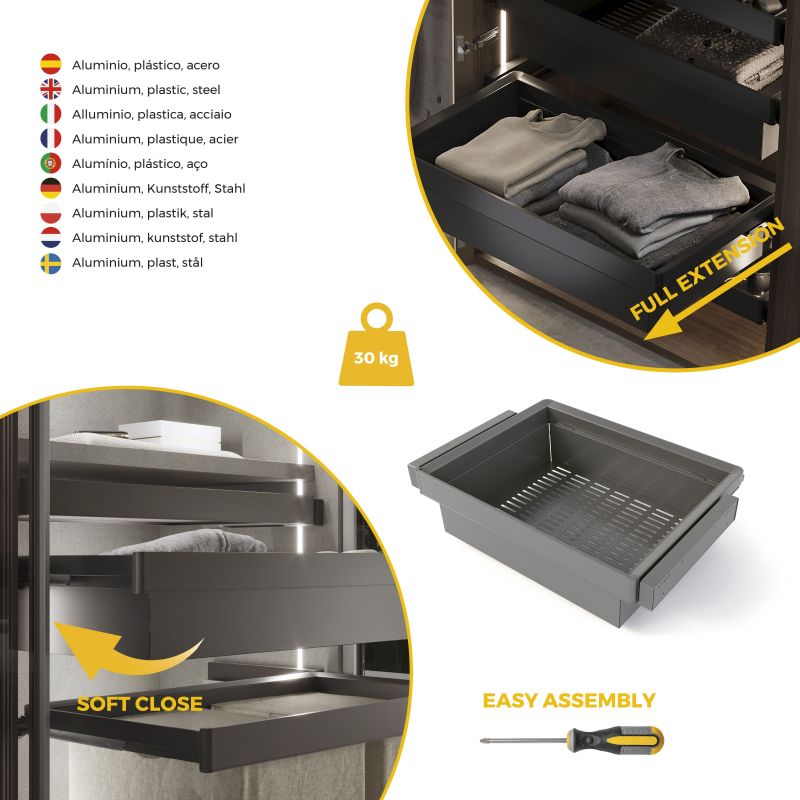 Offrez à votre armoire une touche de raffinement et un rangement structuré avec le panier métallique sur cadre coulissant Quartz de Emuca, conçu pour les meubles de 600 mm de large. Élégant, pratique et robuste, il comprend un cadre coulissant à fermeture douce et un tiroir métallique, le tout dans une finition titane contemporaine qui valorise l’intérieur de tout dressing.