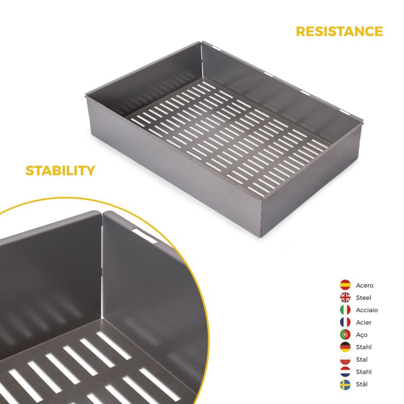 Le cadre coulissant est conçu en aluminium de haute qualité et doté de coulisses à extraction totale avec amortisseur, pour une manipulation fluide, silencieuse et sans à-coups. Sa structure robuste supporte jusqu’à 30 kg et se fixe simplement sur les parois latérales de l’armoire. Grâce aux entretoises et au système de réglage intégré dans les coulisses (jusqu’à 13 mm par côté), l’ajustement est précis, même dans des niches aux dimensions variables. Il s’adapte parfaitement aux caissons d’une profondeur minimale de 460 mm.