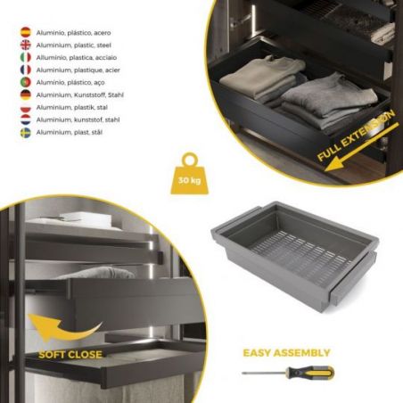 En savoir plus ...Offrez à votre armoire ou votre dressing une organisation impeccable avec le panier coulissant Quartz de Emuca, composé d’un cadre amovible à fermeture douce et d’un tiroir métallique modulaire. Il est pensé pour conjuguer style et praticité grâce à son design soigné en finition titane qui s’intègre harmonieusement dans tous les espaces de rangement moderne.