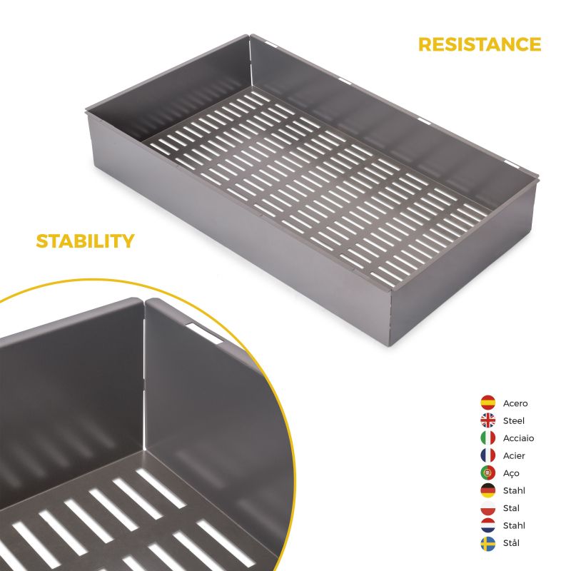 Le cadre coulissant est conçu en aluminium de haute qualité et doté de coulisses à extraction totale avec amortisseur, pour une manipulation fluide, silencieuse et sans à-coups. Sa structure robuste supporte jusqu’à 30 kg et se fixe simplement sur les parois latérales de l’armoire. Grâce aux entretoises et au système de réglage intégré dans les coulisses (jusqu’à 13 mm par côté), l’ajustement est précis, même dans des niches aux dimensions variables. Il s’adapte parfaitement aux caissons d’une profondeur minimale de 460 mm.