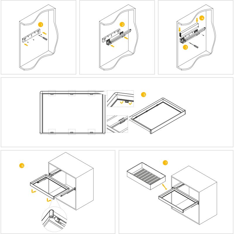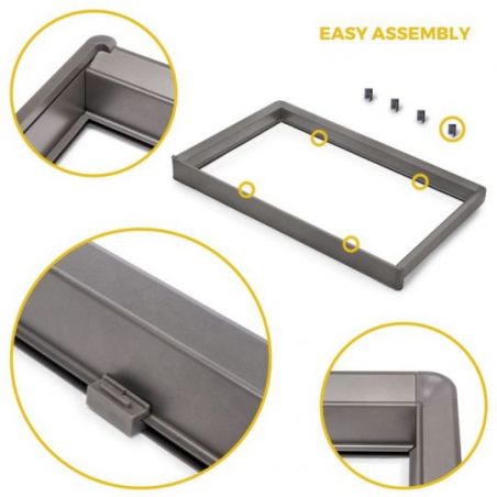 Le cadre coulissant Quartz est fabriqué en aluminium de qualité supérieure, avec des coulisses à extraction totale et un mécanisme de fermeture en douceur. Il garantit une manipulation fluide, silencieuse et fiable au quotidien. Avec une capacité de charge allant jusqu’à 30 kg, ce cadre assure stabilité et longévité. Grâce à ses glissières réglables (jusqu’à 13 mm par côté) et aux entretoises incluses, il s’adapte précisément à votre meuble, à partir d’une profondeur minimale de 460 mm. L’installation est rapide et sans complication : il suffit de visser le cadre latéralement dans le caisson.