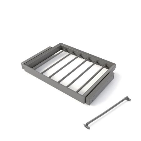 Le kit porte pantalons se pose sans outil sur le cadre, il comprend 7 barres en aluminium avec embouts plastiques pour un maintien stable et sans risque de glissement. Ce design ouvert assure une excellente ventilation et permet d’éviter les faux plis tout en facilitant la prise en main. Sa finition titane (RAL 7039) ajoute une touche contemporaine et raffinée à l’intérieur de votre meuble.
