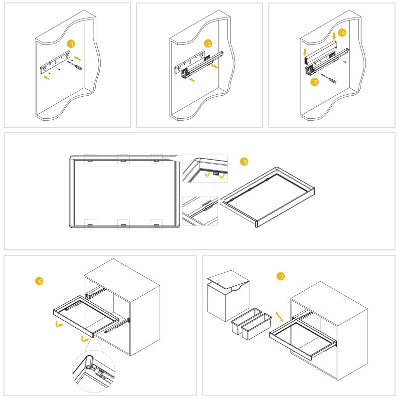 Le cadre extractible repose sur des coulisses à sortie totale avec fermeture amortie, assurant un coulissement fluide et silencieux. Fabriqué en aluminium haute qualité, il supporte jusqu’à 30 kg de charge, ce qui le rend idéal pour accueillir différents modules de rangement. Il se fixe directement aux parois du meuble pour une tenue solide dans le temps.