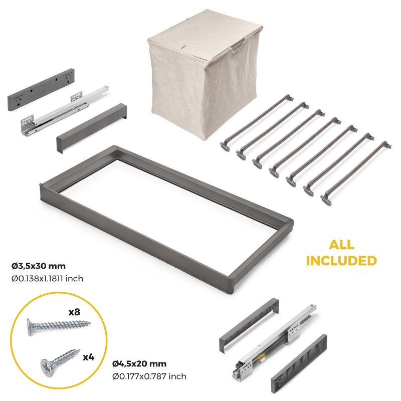 Transformez votre armoire ou votre dressing avec le Kit Quartz, qui combine un cadre amovible avec des coulisses à fermeture douce, un porte-pantalons à tiges et un panier à linge. Ce kit est conçu pour ceux qui souhaitent maximiser la fonctionnalité et le style, avec une finition élégante en titane, idéale pour tout espace de rangement.