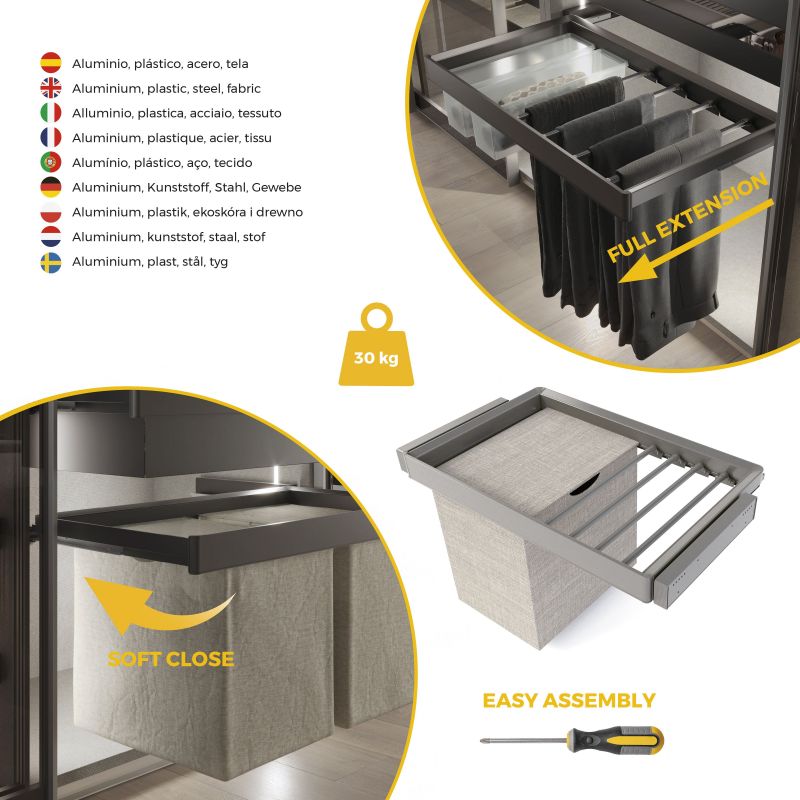Le cadre coulissant est conçu en aluminium robuste et s’équipe de coulisses à sortie totale avec fermeture amortie, pour une ouverture fluide et sans bruit. Sa capacité de charge de 30 kg vous permet de l’utiliser sans contrainte, même pour des vêtements lourds ou des accessoires volumineux. Grâce à ses entretoises fournies, il s’adapte parfaitement à différents intérieurs d’armoire tout en garantissant une finition soignée.