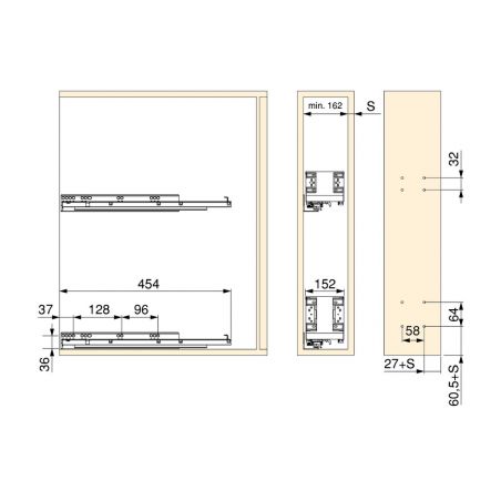 Il offre un réglage de la façade de ±2 mm en vertical et ±1,5 mm en horizontal, ainsi qu'un réglage en hauteur intégré dans les coulisses (4,5 mm), ce qui facilite un ajustement précis pour une installation parfaite. Il est conçu pour un montage sur le côté gauche et est compatible avec les meubles dotés de panneaux de 16, 18 et 19 mm, ce qui le rend polyvalent et adaptable à différentes configurations.