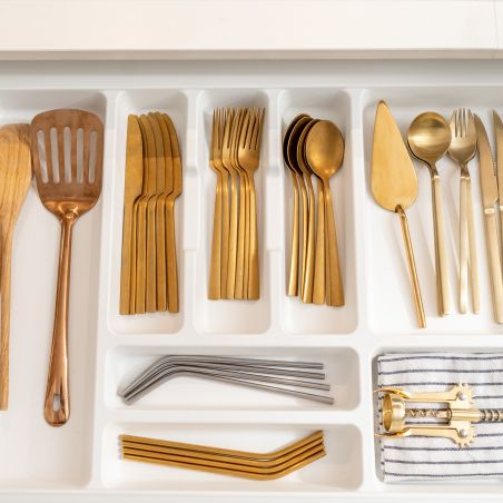 Range-couverts pour tiroirs de cuisine avec un design droit et une grande capacité de rangement pour les couverts et autres ustensiles de cuisine, tirant le meilleur parti de l'espace. Il est fabriqué en plastique et son installation est extrêmement rapide et facile.
