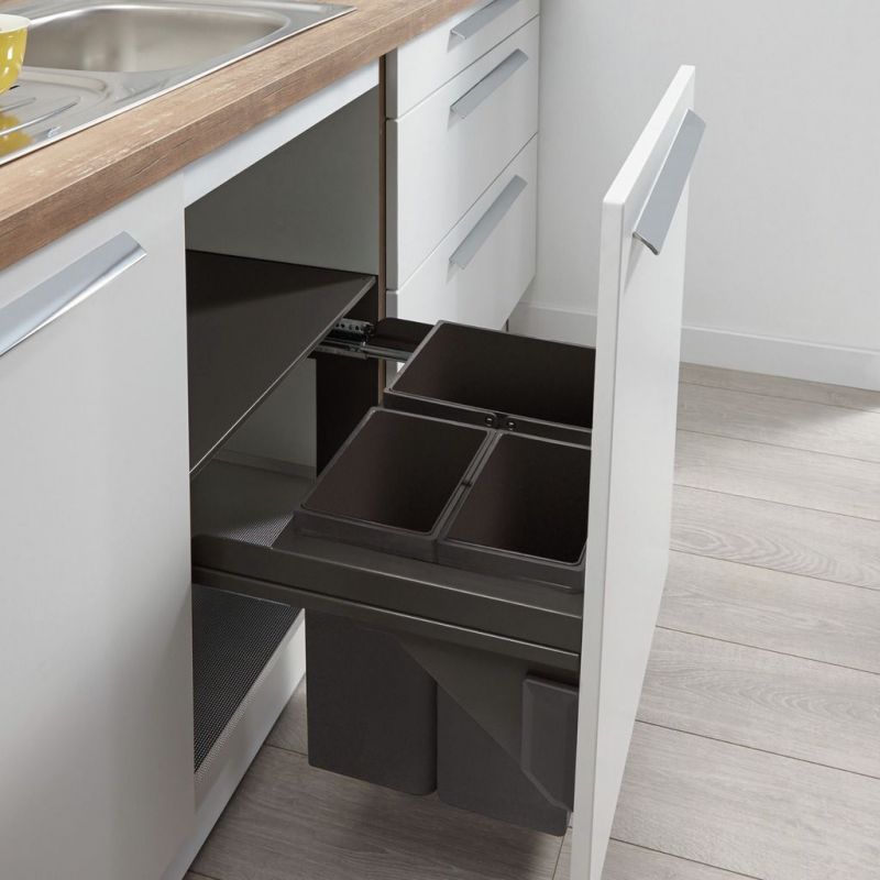 Un couvercle fixe vient recouvrir l’ensemble des bacs et reste en place dans l’armoire lors de l’ouverture. En plus de limiter les odeurs, il peut servir de support de rangement pour sacs poubelles, éponges ou produits d’entretien. Le mécanisme d’amortissement intégré assure une fermeture douce et silencieuse, idéale pour une utilisation quotidienne sans nuisance sonore.