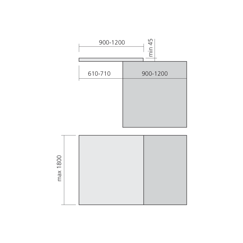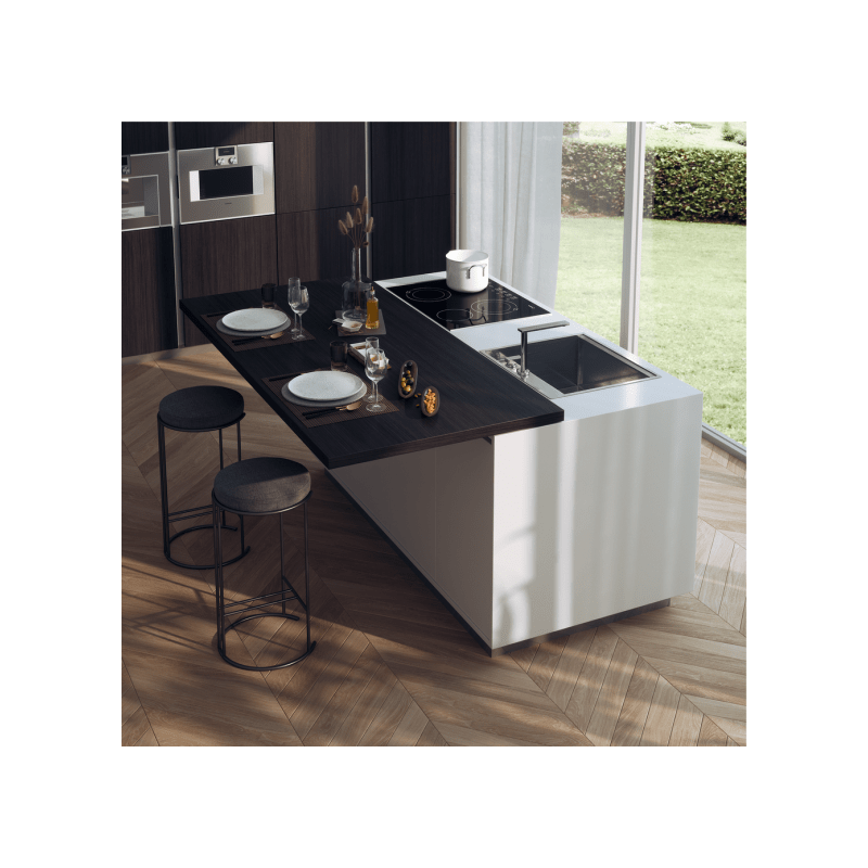 Ce système est livré sans plateau afin de vous permettre une personnalisation complète selon vos matériaux et finitions préférés. Il accepte des panneaux à partir de 12 mm d’épaisseur et peut être installé sur un ilot allant jusqu’à 1800 mm de large.