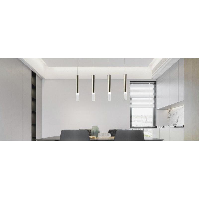 Le luminaire suspendu Gwen 4 LED se présente dans un élégant boîtier en aluminium en forme de barre avec un couvercle en plastique blanc. Quatre éléments lumineux suspendus côte à côte s'intègrent avec style dans l'aménagement de la cuisine. Le plafonnier à quatre lampes peut être placé au-dessus d'une table à manger ou d'un comptoir. Il y diffuse une lumière agréable et claire. Un montage apparent est prévu à l'a...
