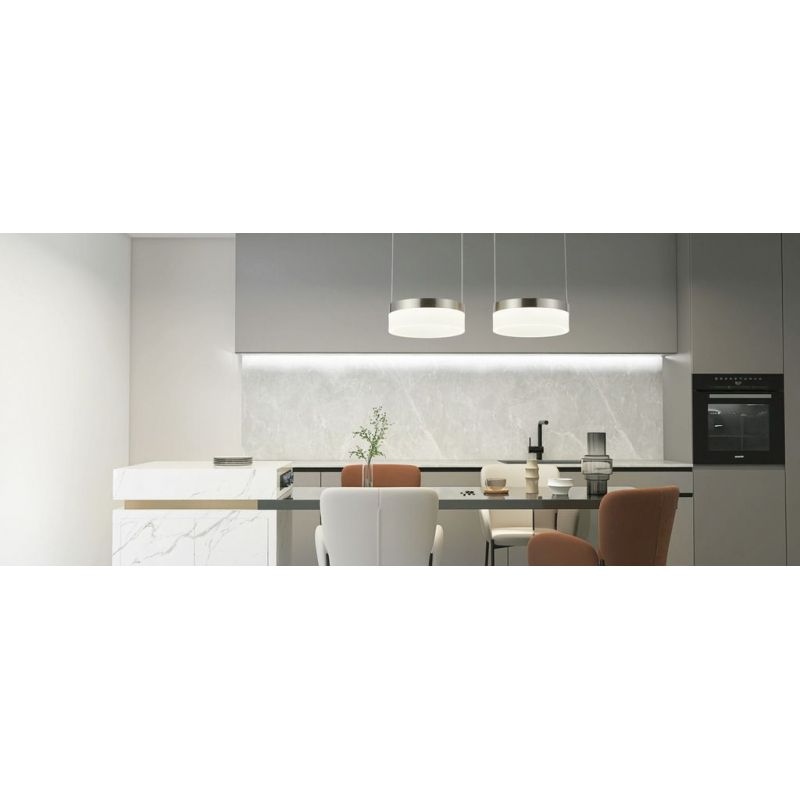 En savoir plus ...La suspension Nicky 2 LED attire tous les regards au-dessus de la table de cuisine ou de l'îlot central et crée une atmosphère agréable pour les repas et les discussions. Son design se caractérise par deux lampes circulaires, qui possèdent un boîtier élégant en aluminium et un cache en plastique. Avec son look moderne et stylé, la lampe suspendue apporte une touche design de bon goût dans la salle à manger. Sa suspension a une longueur de 1 200 mm et peut être raccourcie jusqu'à 500 mm, ce qui permet de l'adapter individuellement à la salle à manger. Grâce à sa source lumineuse LED, la lampe offre un éclairage économe en énergie avec un faible dégagement de chaleur et un rendement lumineux élevé. Selon l'ambiance et l'atmosphère souhaitées, il est possible de choisir entre deux températures de couleur différentes : 3 000 K en blanc chaud et 4 000 K en blanc neutre selon le modèle choisi. L'allumage et l'extinction sont commandés par l'interrupteur d'éclairage.