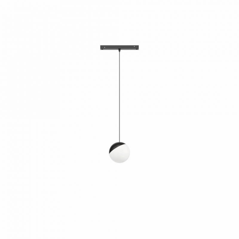 Luminaire suspendu. Suspension en verre pour rail d'alimentation Easytrack. Boîtier en aluminium thermolaqué, boule en verre blanc opale.