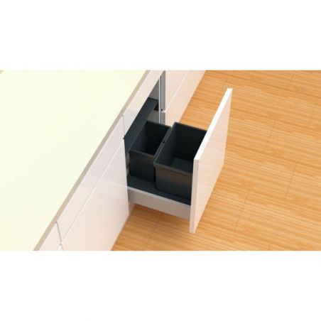 La poubelle Pullboy Versa 265 K/500-2 est conçue pour être montée sur des tiroirs existants d'une profondeur nominale de 400 mm et offre une solution pratique pour le tri des déchets. Elle dispose de deux collecteurs de déchets d'un volume total de 22 litres pour collecter et trier les déchets ménagers et les matériaux recyclables. Le plus petit conteneur a une capacité de 7 litres, le plus grand de 15 litres. Des couvercles individuels adaptés ferment les conteneurs intérieurs et minimisent la formation d'odeurs. Un couvercle complet en option peut également être installé derrière la façade supérieure pour gagner de la place et permettre une fermeture sécurisée. Pour protéger le sol de l'humidité et des salissures, la poubelle encastrable est livrée avec un bac de fond découpable.