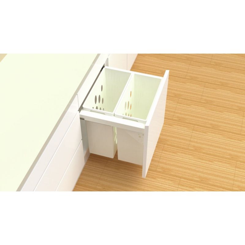Le tiroir à linge compact WESCO® Pullboy Soft Comfort Laundry 550 K/600-2 permet de pré-trier le linge sale de manière peu encombrante. Le système de tiroir frontal est conçu pour des armoires de 600 mm de large et se distingue par sa faible profondeur d'encastrement de seulement 330 mm. Deux bacs étroits de forme carrée sont disposés l'un à côté de l'autre. Ils ont chacun une capacité de 32 litres, ce qui donne un volume total de 64 litres. Grâce aux poignées intégrées, les bacs peuvent être facilement retirés de leur support pour remplir le lave-linge. Les trous latéraux dans les parois assurent une bonne aération du linge. Le collecteur de linge se ferme de manière particulièrement silencieuse et confortable grâce à la technologie d'amortissement et de fermeture en douceur intégrée. Ses composants sont fabriqués en plastique blanc et sont conçus pour durer. Pour le montage, le système d'extension complète est fixé à la paroi latérale et au panneau avant de l'armoire.
