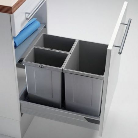 Le système de tri des déchets WESCO® Pullboy Vario 320 S/500-3 est idéal pour les tiroirs à casseroles existants. Ce système de tri des déchets encastrable ne nécessite qu'une faible hauteur de montage de 320 mm et peut être intégré dans des meubles bas de cuisine d'une largeur de 500 mm. Le volume total de 33 litres est réparti entre trois poubelles de 17 et 8 litres. Les conteneurs carrés peuvent être retirés in...