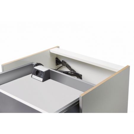 La prise encastrable CON-AKTIV® Evoline® Wing 1 USB A + C est une solution intelligente pour une alimentation électrique cachée à l'intérieur des tiroirs. Le guidage du câble conçu pour l'application avec deux bras coudés flexibles s'avère particulièrement avantageux. Cela permet d'éviter que le câble d'alimentation ne tombe vers le bas. Le modèle est une prise individuelle complétée par deux ports USB de type A et C. Il est possible de brancher des ustensiles de cuisine et de charger en même temps des téléphones portables ou des tablettes. L'installation dans les tiroirs est possible à partir d'une largeur de 400 mm et d'une longueur d'extension de 590 mm. Le kit comprend tous les éléments de fixation nécessaires pour les parties de meubles en bois et en métal ainsi qu'un câble d'alimentation extra-long. La fiche Schuko est fournie en vrac.