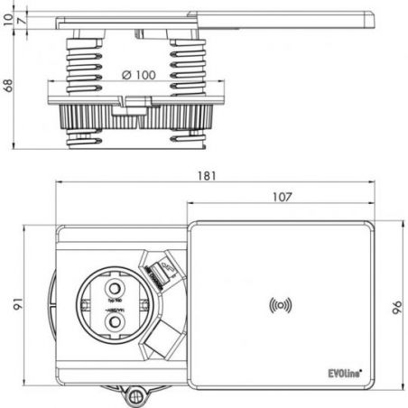La prise encastrable CON-AKTIV® Evoline® Square USB A Qi séduit par son design à la fois moderne et discret. Elle est équipée d'un couvercle coulissant laqué couleur inox qui s'ouvre et se ferme très facilement. Le couvercle abrite une station de charge inductive conforme au standard Qi répandu et qui permet de charger sans fil les téléphones portables courants. De plus, un port USB de type A est disponible dans l'élément de prise, ce qui permet de charger deux appareils simultanément si nécessaire. La prise de courant avec contact de terre est livrée séparément et le kit comprend également un câble d'alimentation. Pour l'encastrement dans le plan de travail, un trou d'environ 80 mm de diamètre est nécessaire. La sortie de câble se trouve sur la face inférieure.