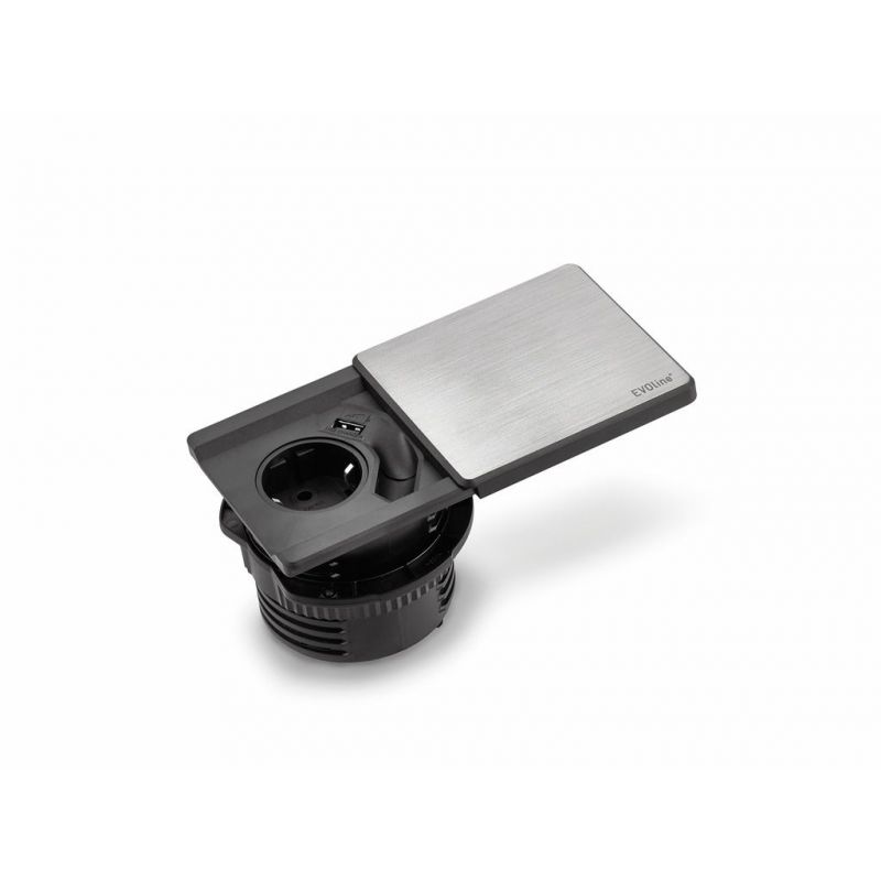 Une solution intelligente : la prise encastrable Evoline® Square USB A pour l'alimentation électrique des différents ustensiles de cuisine. Lorsqu'elle est fermée, elle se distingue à peine de la surface du plan de travail et apporte une touche moderne à l'architecture de la cuisine. Le design est valorisé avec style par le couvercle laqué de couleur inox. Un déplacement latéral du couvercle permet d'utiliser la prise de courant située en dessous. En outre, un chargeur USB de type A est disponible pour recharger par exemple le téléphone portable à portée de main pendant que l'on travaille dans la cuisine. Le kit comprend un câble de raccordement extra long avec sortie de câble vers le bas, ce qui laisse une grande marge de manuvre lors de l'installation dans le coin cuisine. La prise de courant de type Schuko est fournie en vrac, une version avec un élément de prise de courant franco-belge est également disponible.