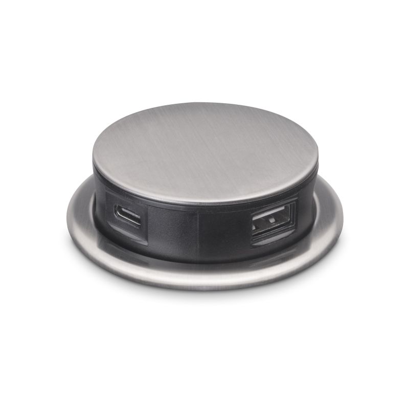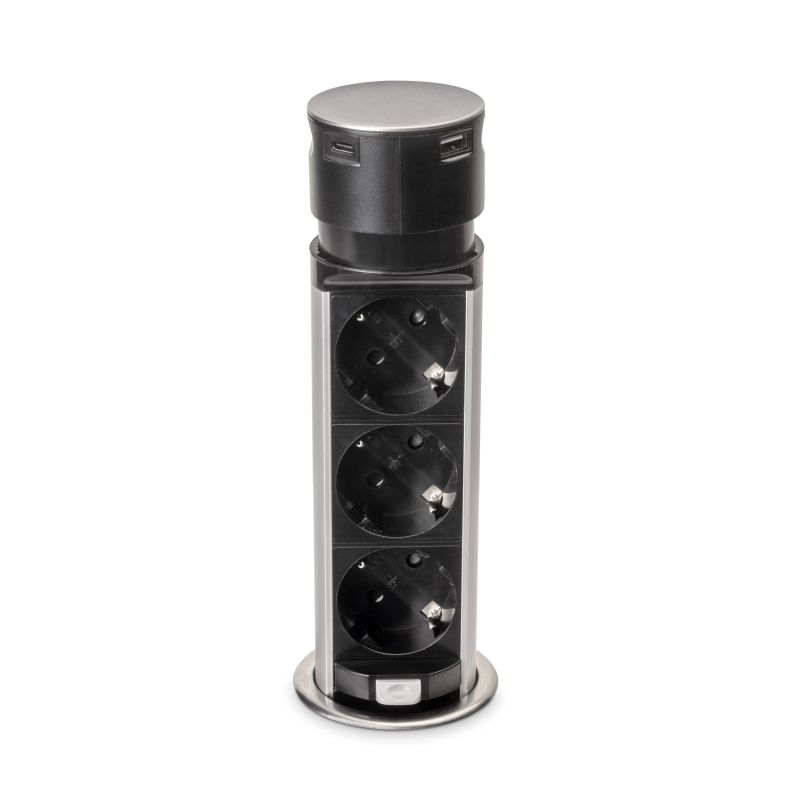 Multiconnecteur Vertikal Push 60, diamètre 60 mm, 3 prises Schuko, 1 USB-A, 1 USB-C, Finition Inox
