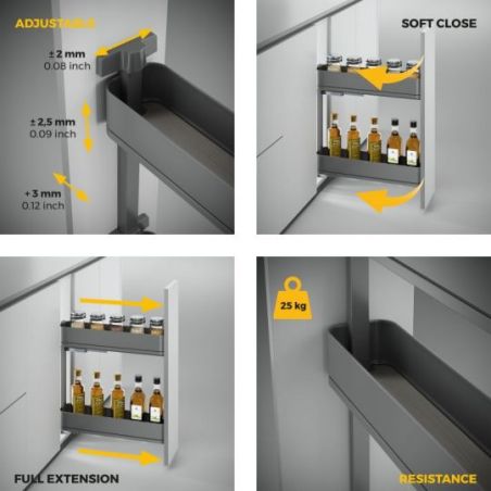 Son système coulissant à extraction totale et fermeture douce garantit une manipulation fluide et silencieuse, tout en permettant un accès complet au contenu. Malgré ses dimensions compactes, il supporte jusqu’à 25 kg de charge, ce qui en fait un accessoire fiable et robuste. Grâce à son réglage de porte en 5 dimensions, l’intégration dans votre meuble est parfaitement ajustée, pour un alignement soigné et harmonieux avec la façade.