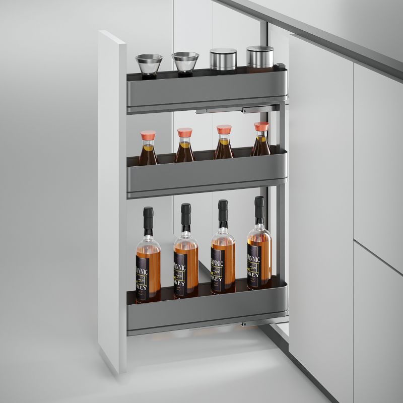 Le range-bouteilles latéral Harmony est spécialement conçu pour optimiser les petits espaces dans les meubles de cuisine. Adapté aux meubles de 150 mm de largeur et 700 mm de hauteur, il transforme un meuble étroit en un rangement fonctionnel et élégant. Idéal pour stocker vos bouteilles, conserves ou bocaux, il offre une solution pratique au quotidien sans compromettre l’esthétique de votre cuisine.