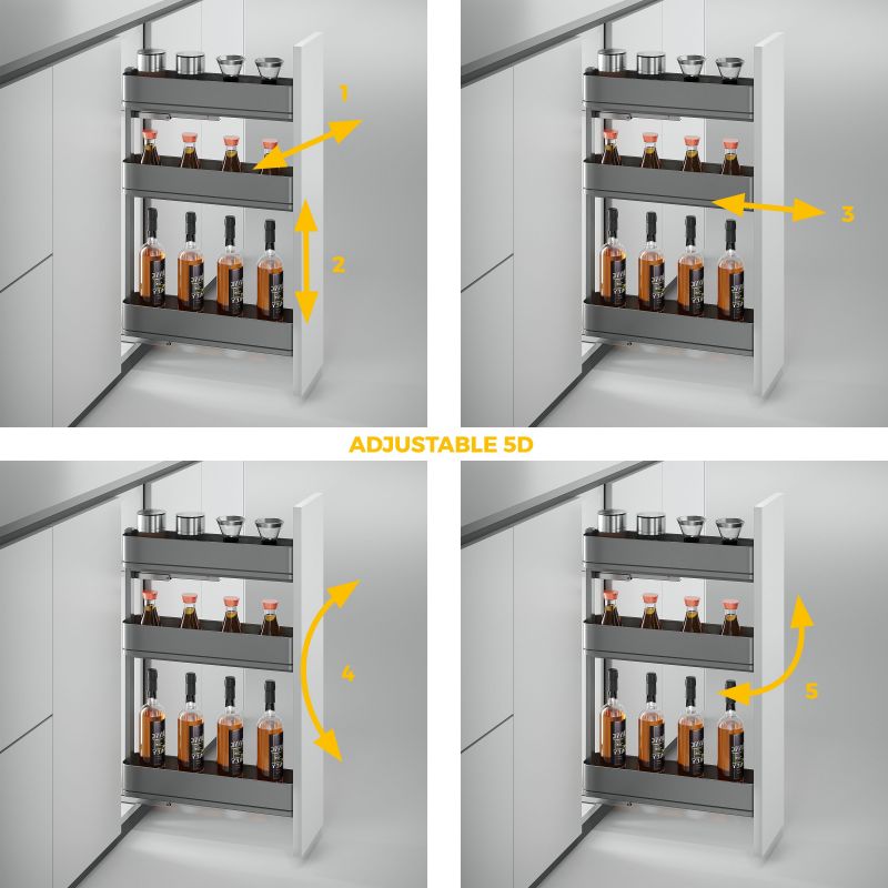 Équipé de coulisses invisibles à extraction totale et fermeture douce, il offre un accès simple et silencieux à l’ensemble de son contenu. Sa solidité lui permet de supporter jusqu’à 25 kg de charge, garantissant une utilisation fiable même en cas de stockage intensif. Grâce à son réglage de porte 5D, il s’intègre avec précision dans votre meuble, assurant un alignement parfait et une finition irréprochable.