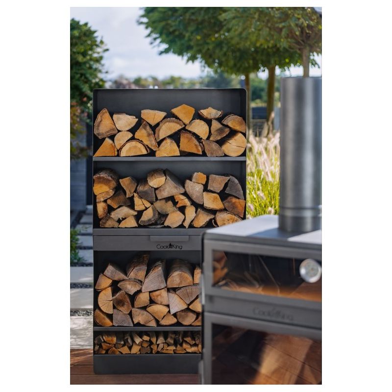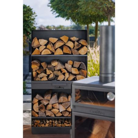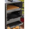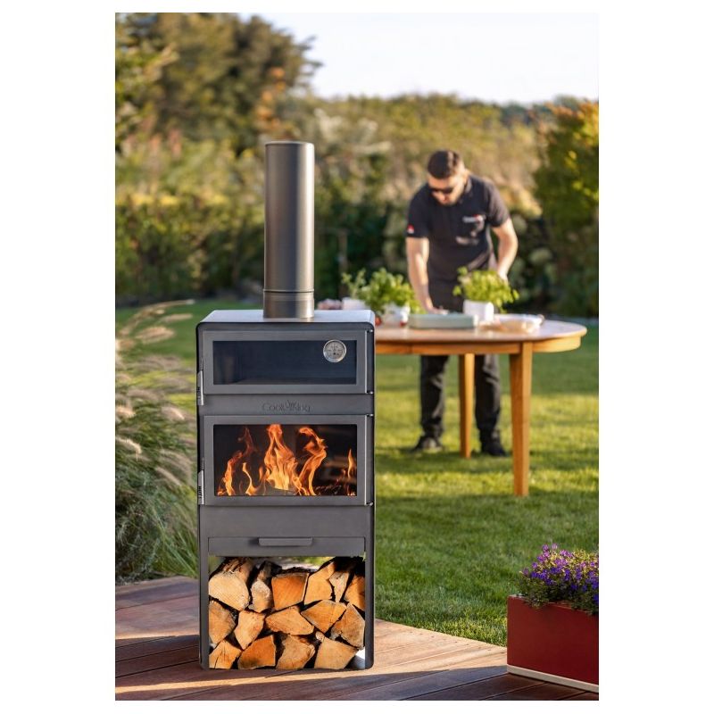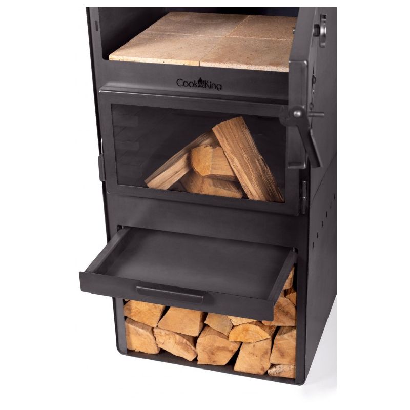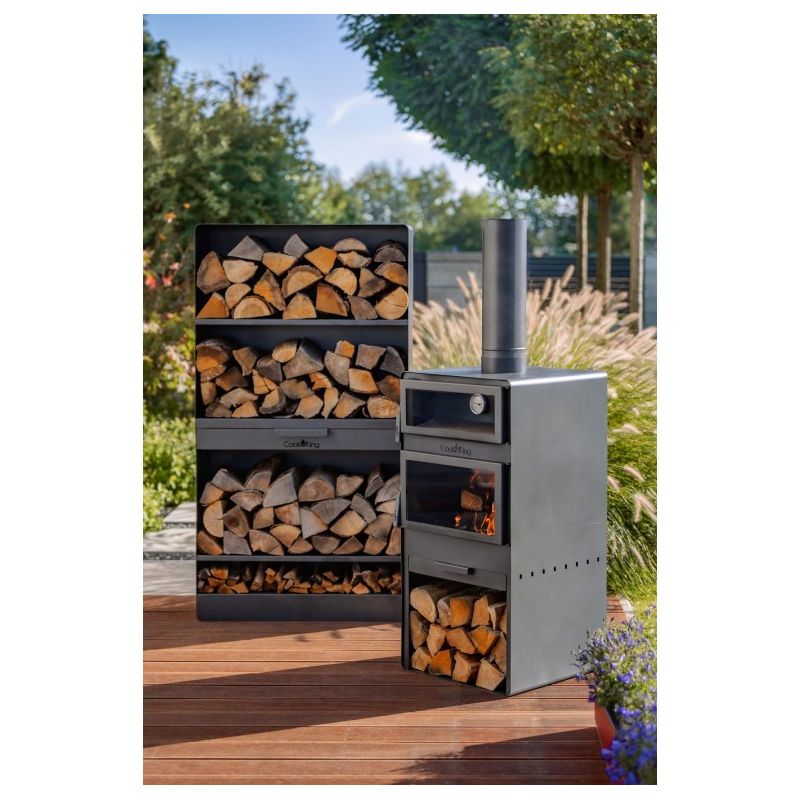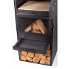 Le poêle est équipé d'une cheminée qui permet l'évacuation de la fumée lors de la combustion. Il possède une étagère où l'on peut stocker une quantité considérable de bois. De plus, l'étagère inférieure protège le sol de la haute température lors de l'utilisation. À l'intérieur du poêle, trois niveaux sont installés pour une grille ou une poêle à griller, ce qui facilite considérablement le contrôle de la température des plats préparés.