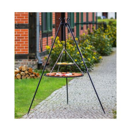 La grille barbecue de jardin à trépied est une solution idéale pour passer des soirées agréables en plein air, que ce soit en famille ou entre amis. Elle est fabriquée en acier de 180 cm de hauteur. Les tôles sont adaptées pour le bois, ainsi que pour le charbon de bois. Le trépied est revêtu de poudre, ce qui crée une protection résistante aux intempéries. Grâce à ses deux zones de cuisson incluses le barbecue permet contrôler aisément la cuisson des grillades ou bien faire reposer un repas, il est aussi parfaitement adapté à une utilisation par plusieur personnes en même temps. Le trépied stable peut être placé sur tout type de surface. Pour parfaire cet équipement en quelques gestes, le trépied est démonté et remonté, ce qui facilite le stockage et le transport. Des décorations avec des éléments forgés font de cette grille un plaisir pour la vue. Le réglage de la grille barbecue vous permet de changer sa hauteur facilement.