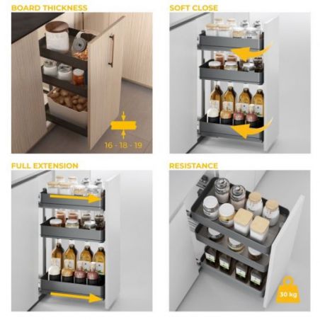Ses coulisses invisibles avec fermeture amortie et extraction totale garantissent un accès facile à tous les ustensiles. Il supporte jusqu'à 30 kg de charge, idéal pour les bocaux, ustensiles et autres produits de cuisine.