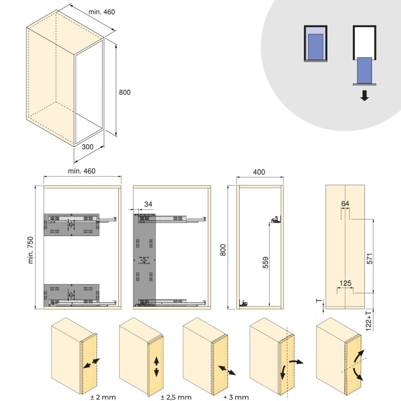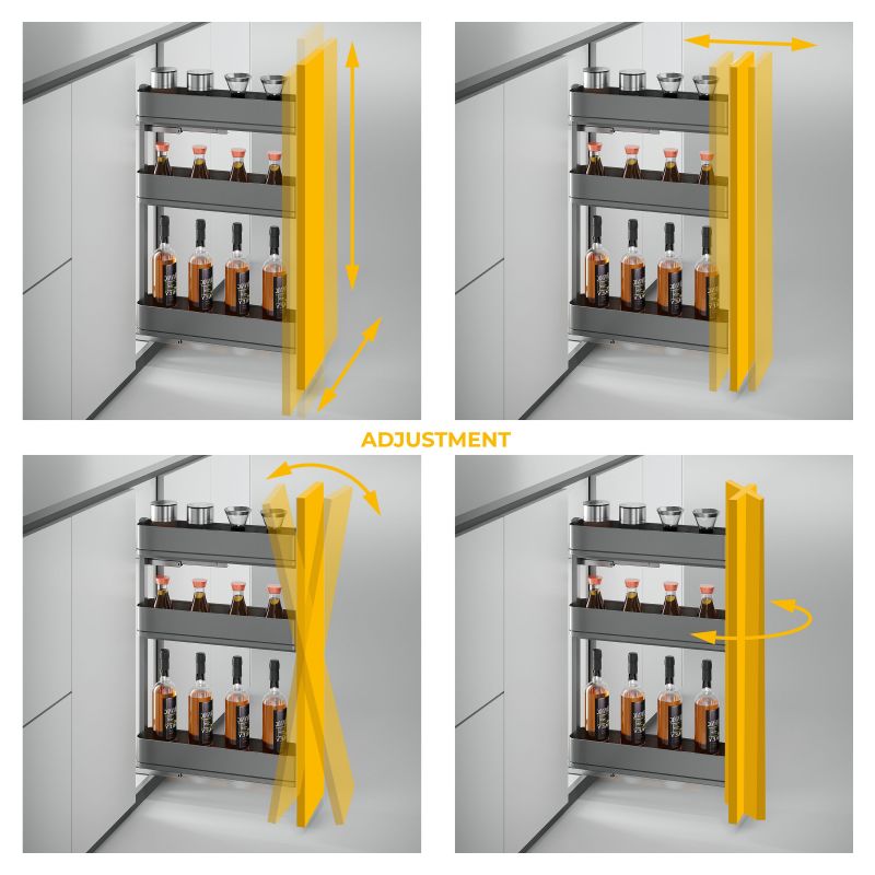 Le réglage de la porte en 5 dimensions (±2,5 mm en hauteur, ±2 mm latéralement et jusqu'à +3 mm en profondeur) garantit une intégration parfaite et un rendu esthétique optimal.