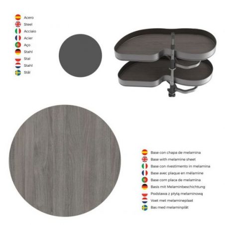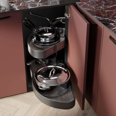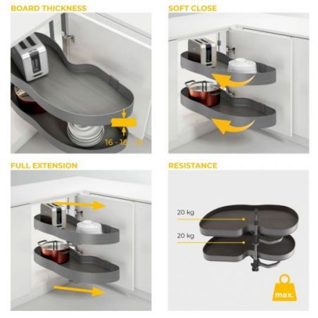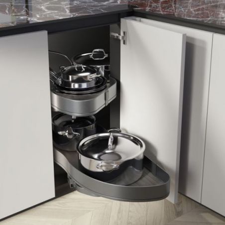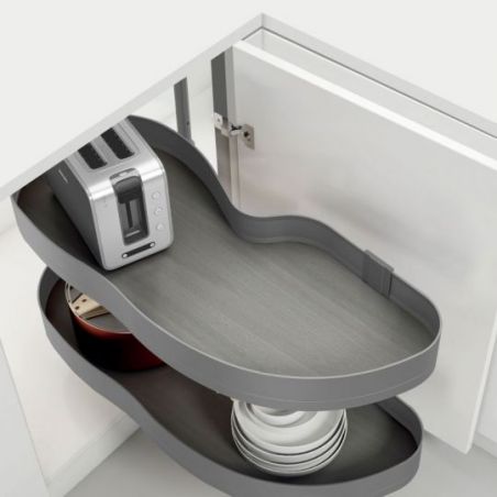 Le système de 2 plateaux pivotants extractible pour meuble d'angle de la gamme Harmony de la marque Emuca est la solution parfaite pour optimiser l'espace dans les meubles d'angle de la cuisine et faciliter l'accès aux ustensiles, aliments ou petits appareils électroménagers.
