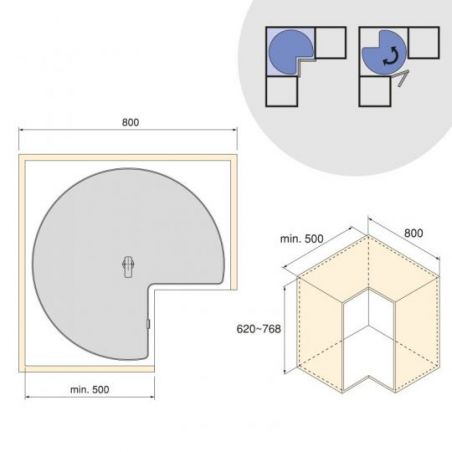 Il est conçu pour être facilement installé dans des modules dune largeur minimale de 862 mm, dune profondeur minimale de 500 mm et dune hauteur réglable de 700 à 800 mm. Convient pour des panneaux de 16, 18 ou 19 mm d'épaisseur. Il est recommandé de monter la porte avec des charnières à bras 90º ou des charnières droites.