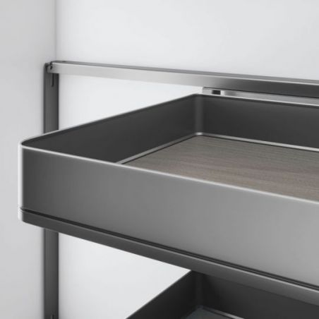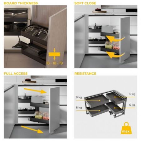Grâce à son système extractible avec 4 plateaux à fermeture douce, il permet de maximiser l'espace intérieur tout en facilitant l'accès aux ustensiles, produits de garde-manger ou petits appareils électroménagers. Sa capacité de charge est répartie en 2 plateaux supportant 6 kg chacun (2 x 6 kg) et 2 plateaux supportant 8 kg chacun (2 x 8 kg), une solution idéale pour stocker des produits lourds.